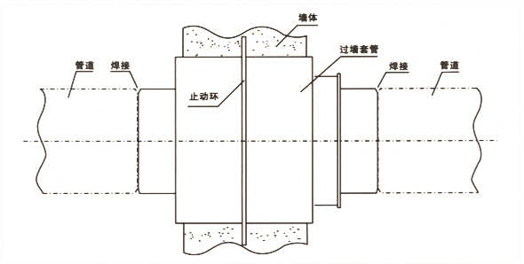 安裝時將過墻管的兩端與主管道焊接后,止動環(huán)與墻體澆注于一體即可完成安裝,也可先澆注再焊接。